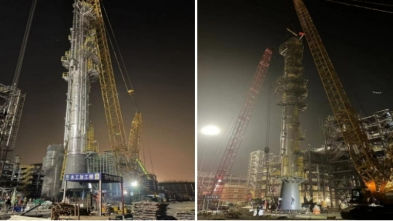 大連恒力石化項(xiàng)目完成苯酚丙酮裝置兩臺塔器吊裝