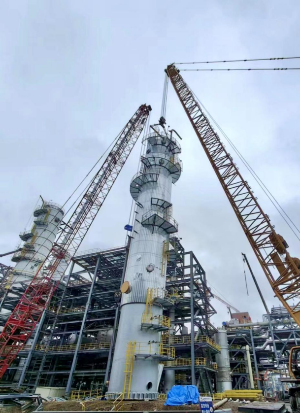 為響應(yīng)公司“奮戰(zhàn)四季度、決勝雙百億”號召,中秋國慶雙節(jié)期間,項目部全體人員堅守施工一線,確保項目吊裝等各項工作穩(wěn)步推進(jìn)。此次吊裝的輕組分塔規(guī)格為Φ3636×59100、設(shè)備自重123噸,重組分塔規(guī)格為Φ3940×65800、設(shè)備自重175噸,是項目主裝置的關(guān)鍵設(shè)備。