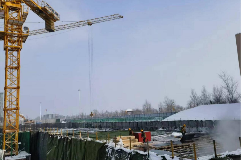該項(xiàng)目所處新疆烏魯木齊,冬季施工時(shí)溫度已達(dá)零下,且隨時(shí)面臨氣溫驟降的可能,工期十分緊張。為安全、高效、高質(zhì)量完成目標(biāo),項(xiàng)目部提前策劃,精心部署,發(fā)揮黨員示范帶頭作用,經(jīng)過60余小時(shí)的攻堅(jiān)奮戰(zhàn),分兩次完成了此次筏板澆筑工作。同時(shí),為防止冬季施工凍融現(xiàn)象對周邊既有結(jié)構(gòu)及基坑內(nèi)部造成不良影響,項(xiàng)目部在筏板四周及中間部位搭設(shè)暖棚及蒸汽暖氣包,澆筑時(shí)嚴(yán)格控制砼入模及成型溫度,及時(shí)覆蓋薄膜,并在砼初凝后覆蓋棉被確保混凝土質(zhì)量。